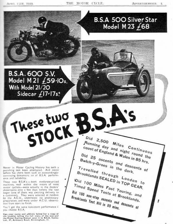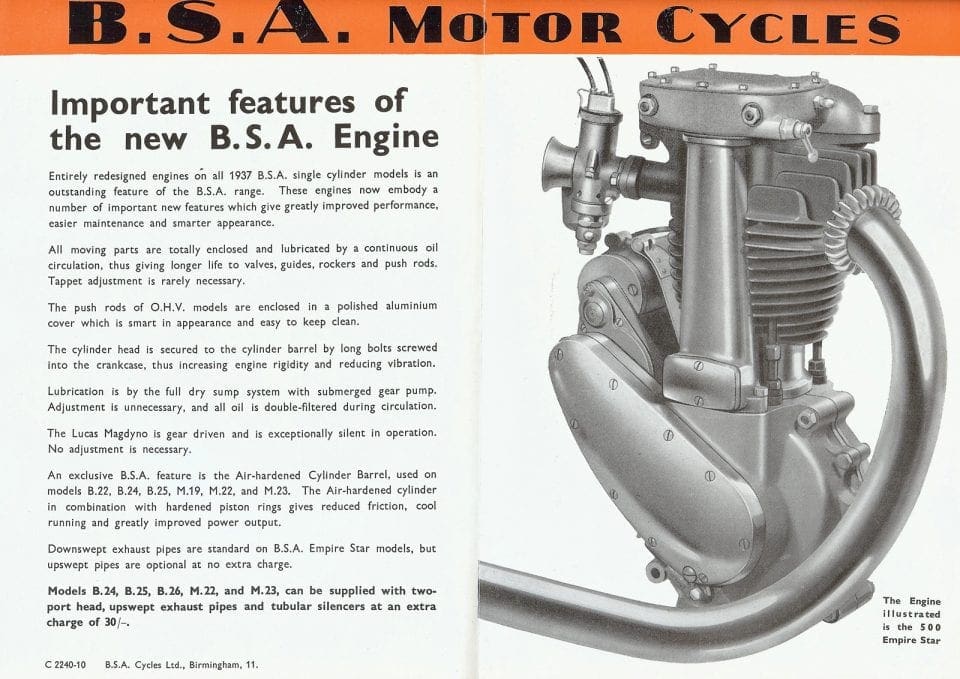 Designer Valentine Page gave BSA’s range a complete revamp for the 1937 season. The 500cc M23 Empire Star took star billing with its neat and tidy motor. ‘All moving parts are totally enclosed,’ announced BSA, ‘and lubricated by a continuous oil circulation thus giving long life to valves, guides, rockers and pushrods’