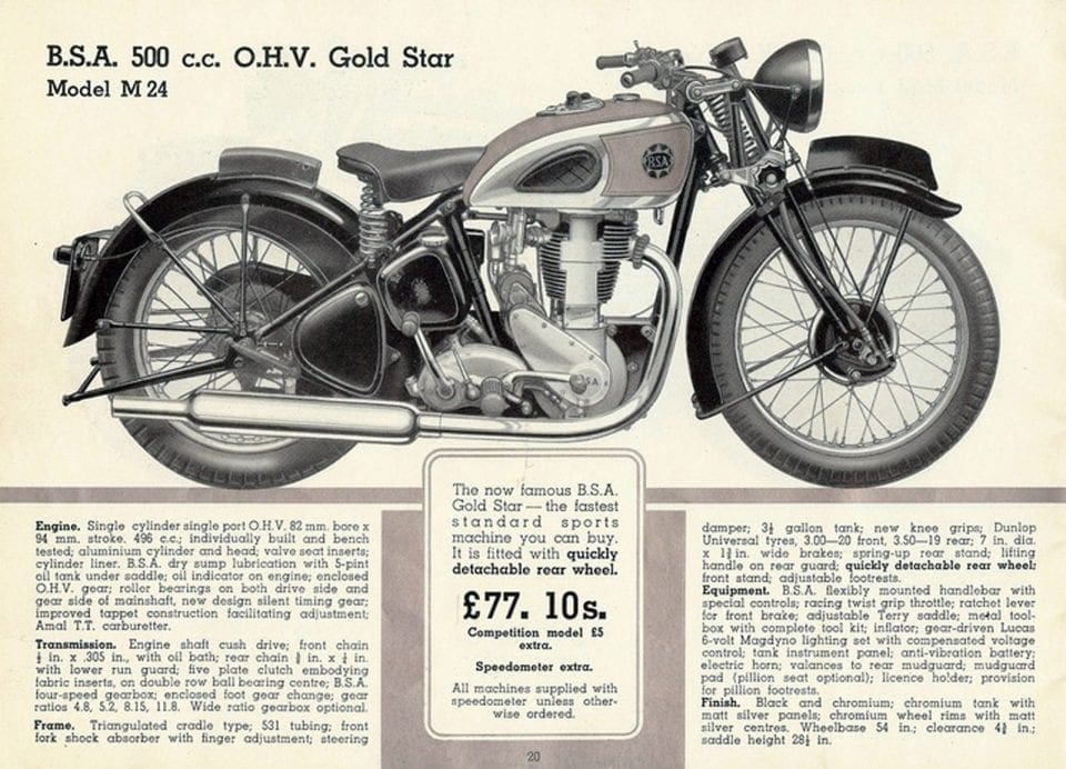 BSA built fewer than 500 M24 Gold Stars before the war. Not a lot of people know this, but the fabled ‘gold star’ was a small, star-shaped gilt lapel badge with ‘100’ on it which was awarded by the British Motor Cycle Racing Club to any rider who lapped at over 100mph at an official club meeting. Unlike ships, which could win any number of Blue Ribands, an individual could only ever earn one gold star in a lifetime