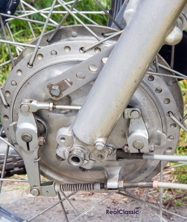 The aluminium-alloy motor sits inside a lightweight frame with a backbone and rear shock mounts formed from pressed steel, but with a round tube forming the cradle. The front wheel is 19” with a 2ls drum brake of just under 8”, whilst the 18” rear wheel has a 7” sls drum. Long travel telescopic forks at the front, high handlebars and dual, nitrogen-filled gas shocks at the rear complete the chassis package.