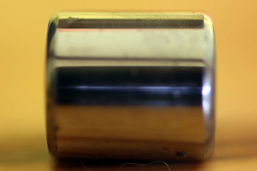 This photo shows the partial crowning of this variant of the MRJA30. The crowning is visible as a distinct grey banding between the flat part of the roller and the usual chamfered edge; as is also shown in the following photo taken from an angle above the bearing: