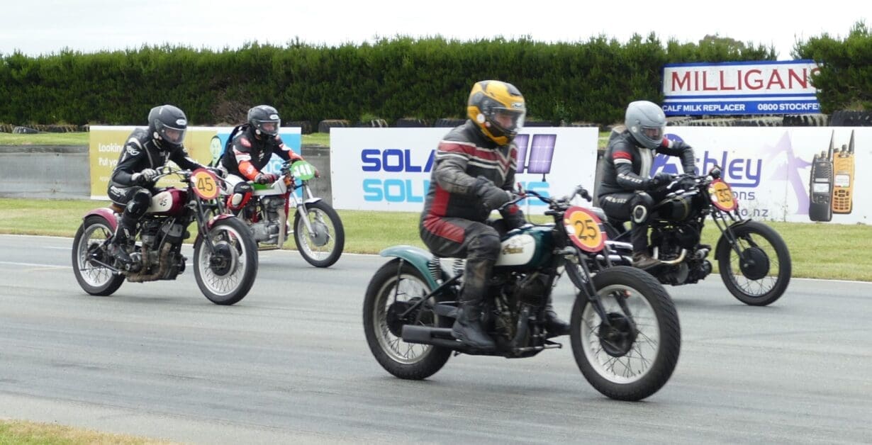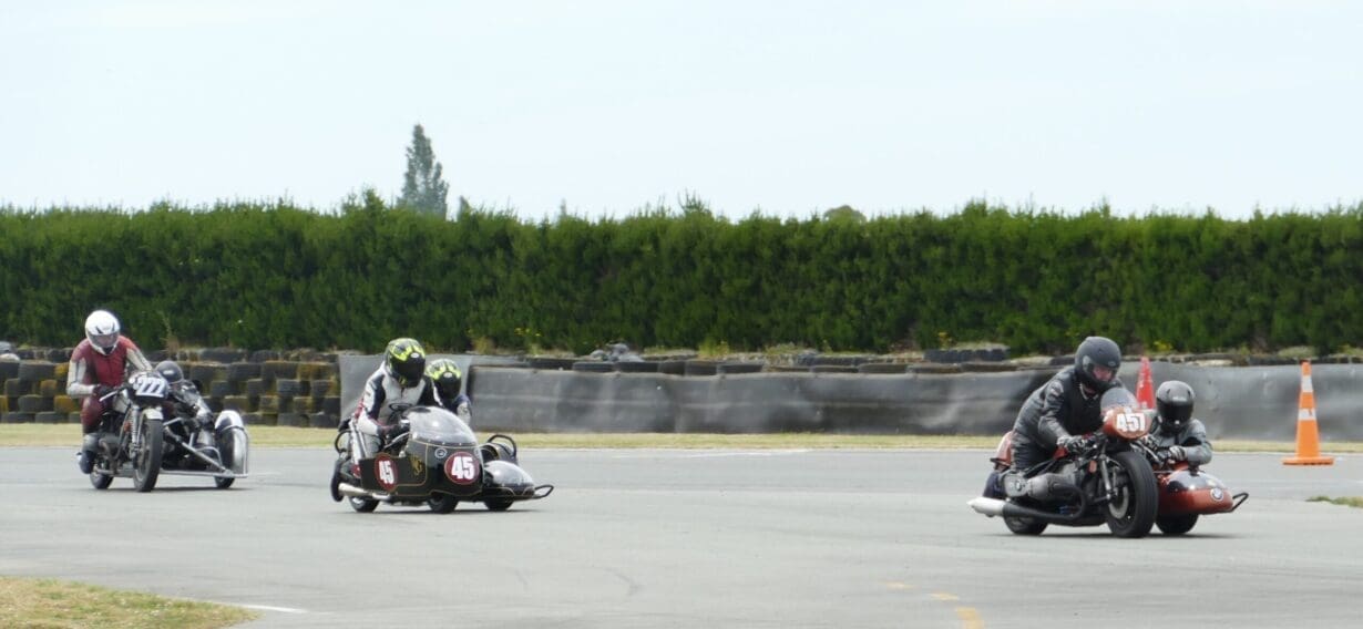 The action took place at Levels International Raceway, about 140km south of Christchurch. The 2.4km ‘long motorcycle circuit’ is relatively flat, roughly shaped like a thigh bone with six left-hand corners (two of which are complete 180 degrees), four right-hand bends, a right-hand hairpin, eight short straights and a back straight that’s nearly a 1km long. The riders like the grippy, technically-demanding circuit and the outfit pilots have to work overtime to keep up with the ever-changing direction and the two long, left-handers. The fastest solo machines post laps of just over a minute, while the fastest outfits circulate in a little less than 1.5 minutes. Earth banks around the circuit provide spectators with excellent views of the track action.