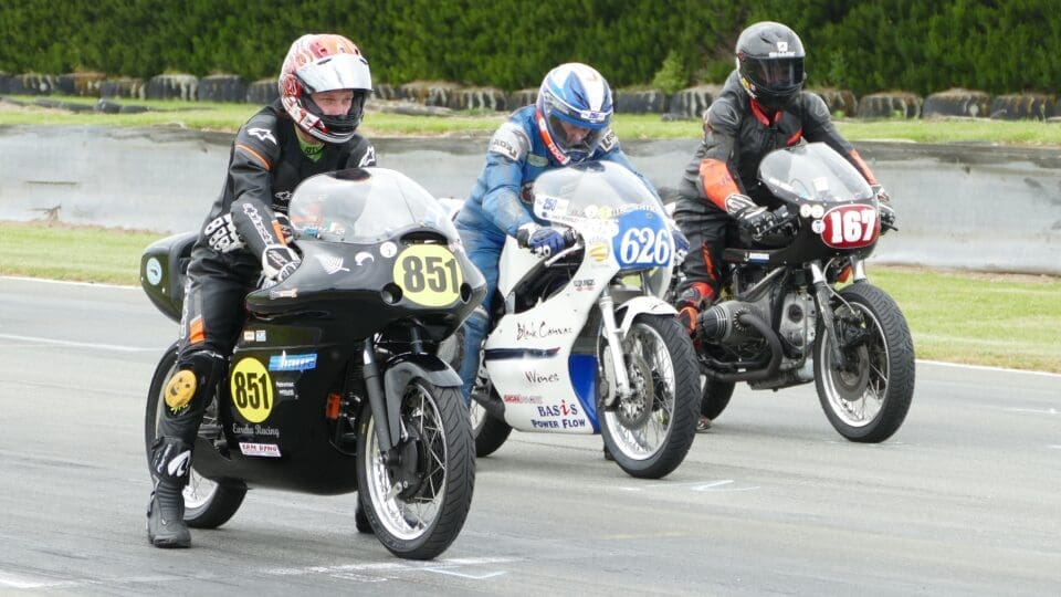 The standout group was the sidecars with an unprecedented 21 entries, many from the North Island. These were spread across four classes and ranged from a 1960 Matchless G12 to a 2018 BLR Kawasaki. Of the nine makes which took part, the Yamaha XS650-based outfits were the most popular closely followed by BMWs. All the sidecars went out in a single group. The large number provided plenty of entertainment and occasionally created logjams – the clerk of the course had to remind them that the grass was not part of the circuit! CAMS took a novel approach to dividing the classic outfits, separating them on wheel size to level the playing field.