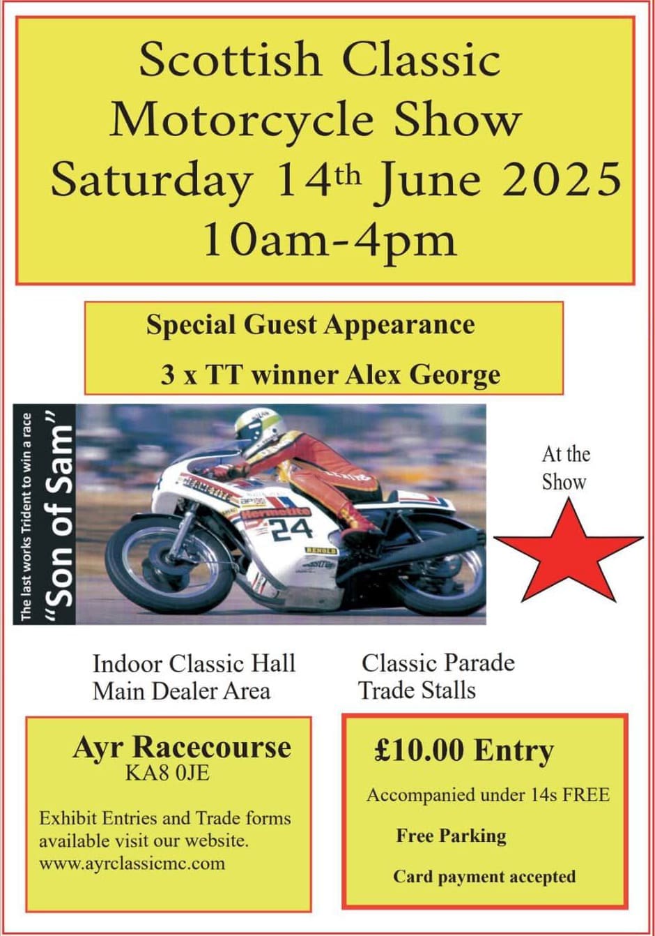 >The Scottish CLASSIC MOTORCYCLE SHOW returned to Ayr Racecourse, KA8 0JE from 10am to 4pm. Special guest TT winner Alex George. Indoor displays, dealer area, classic parade, trade stalls, refreshments. Free parking. Admission £10. ayrclassicmc.com