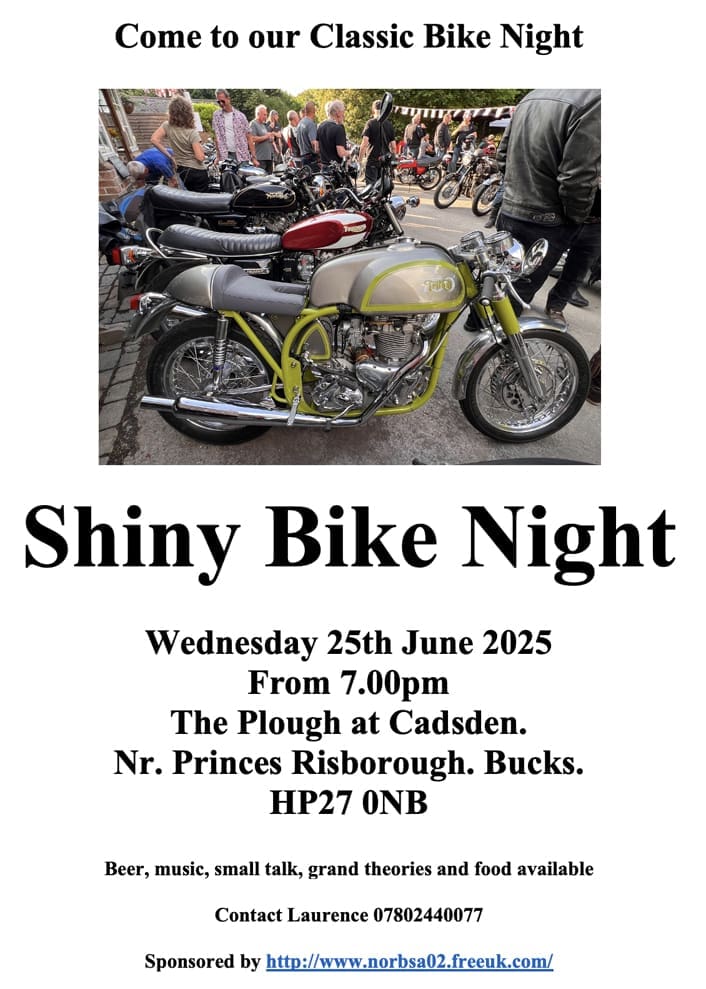 >The BBCMMC’s SHINY BIKE NIGHT runs from 7pm at The Plough Pub at Cadsden, near Princes Risborough, HP27 0NB. Free admission; music, awards, raffle and refreshments